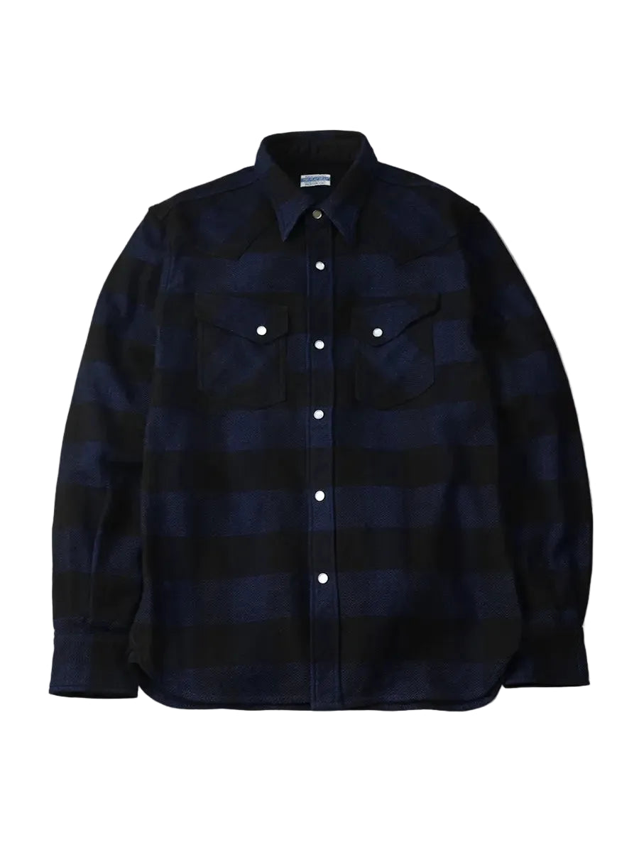 Woven in Japan from indigo-dyed cotton flannel on traditional shuttle looms, this Western shirt combines a rich block check pattern with a soft, brushed hand for warmth and depth. Designed with classic Western details; including sawtooth yokes, flap chest pockets, and branded snap closures, it balances rugged workwear roots with refined silhouette and everyday versatility.