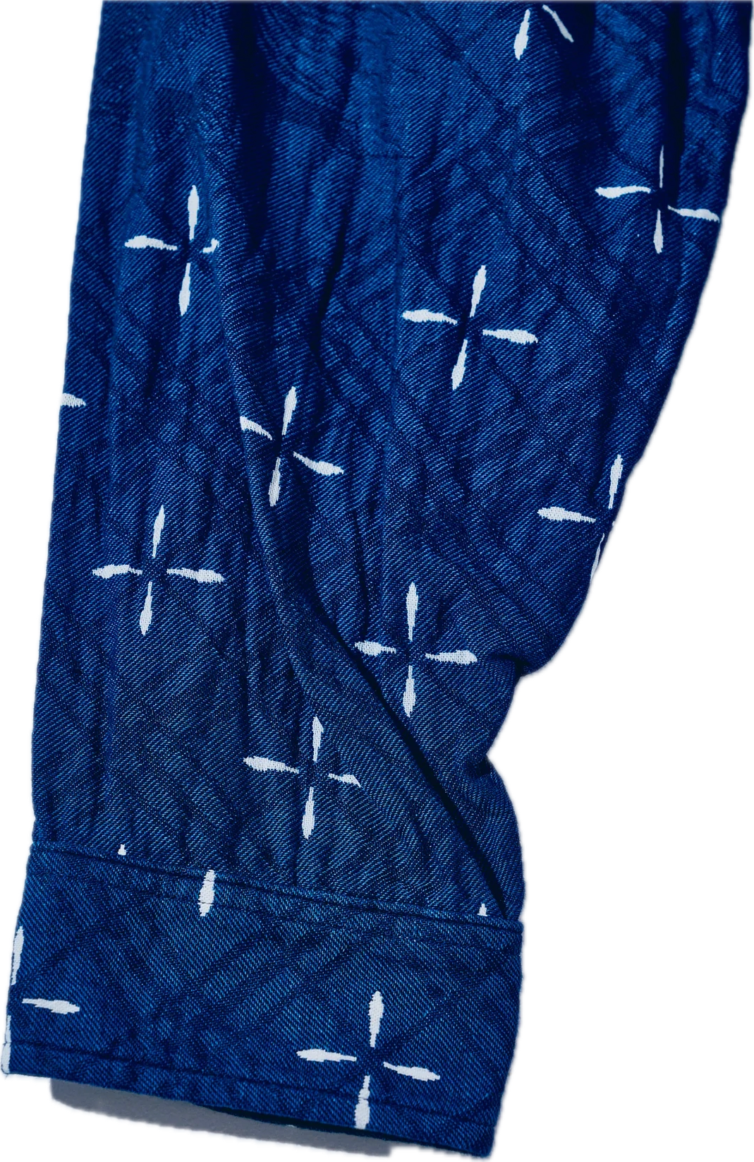 Crafted from an intricate double-weave jacquard fabric, this work shirt features the historic Narihirabishi goldfish motif woven in rope-indigo and white threads; exposing the pattern gradually as the shirt fades.