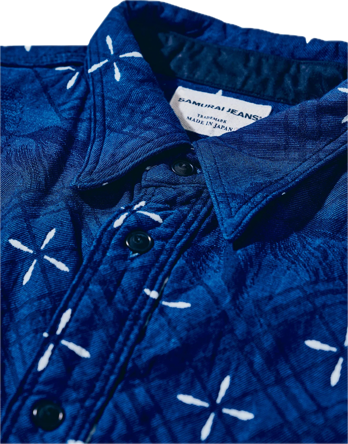 Rope-dyed jacquard built for bold texture. Samurai’s Narihirabishi Goldfish Work Shirt blends artisan fabric with timeless construction. Shop now.