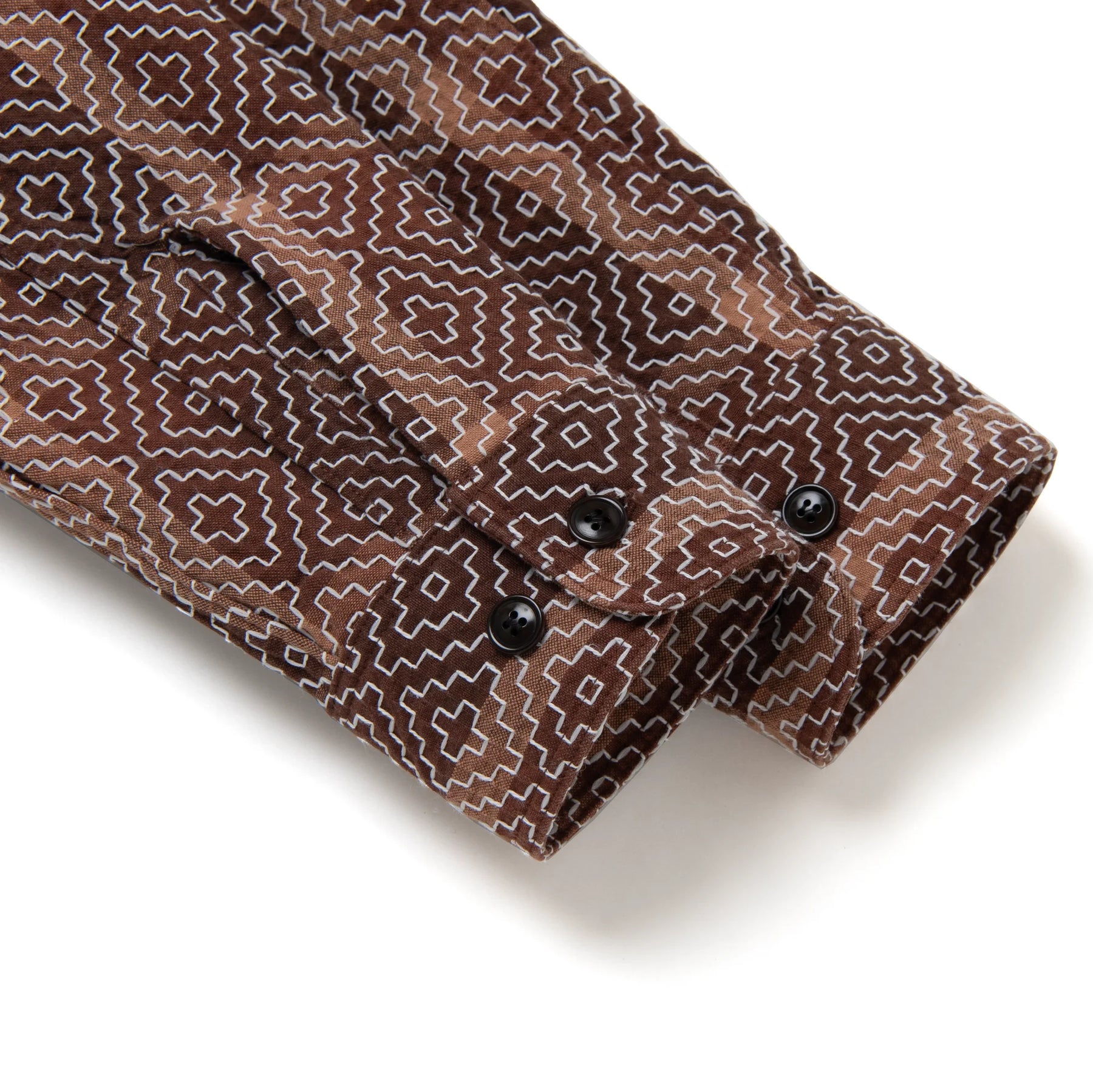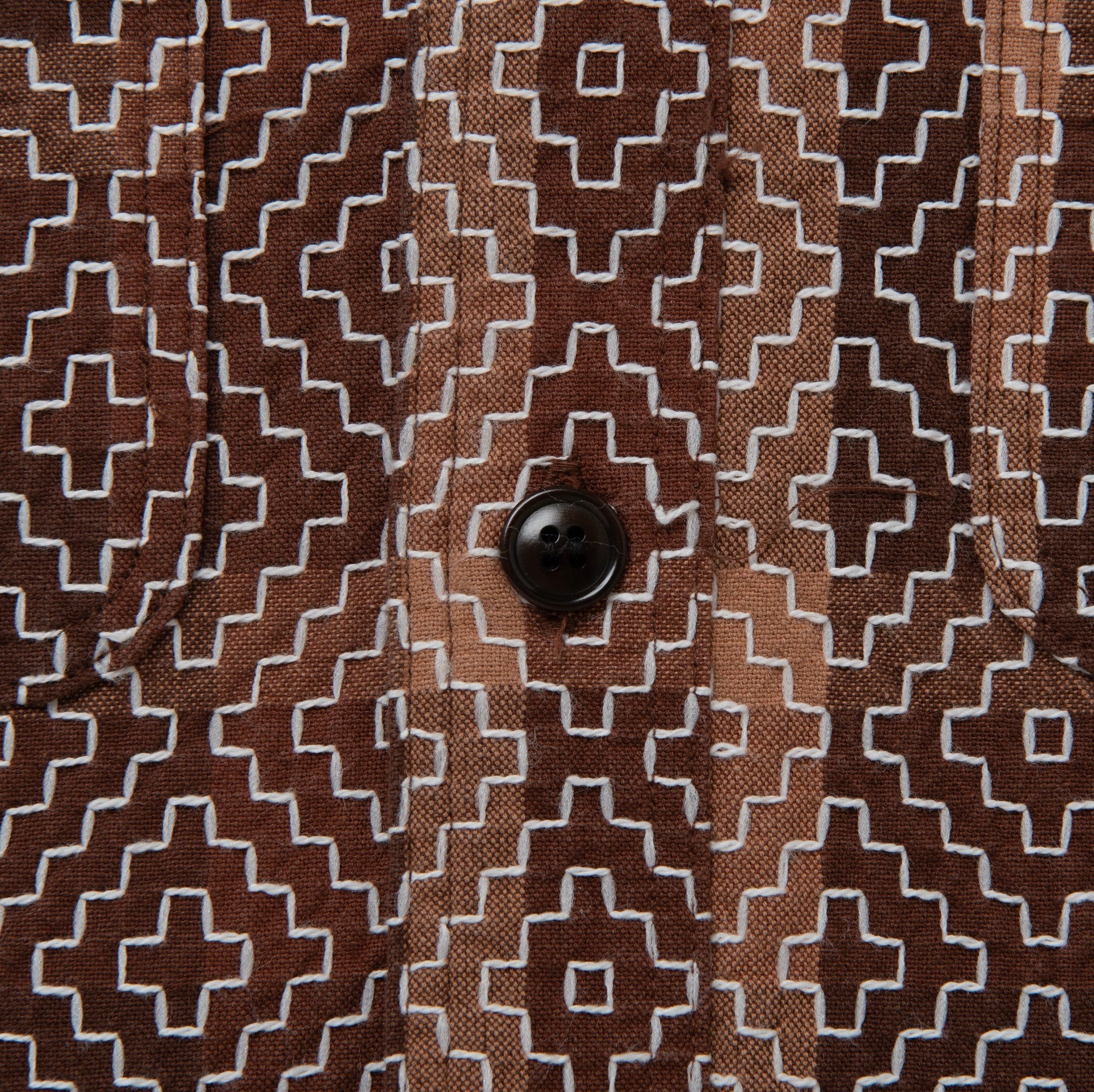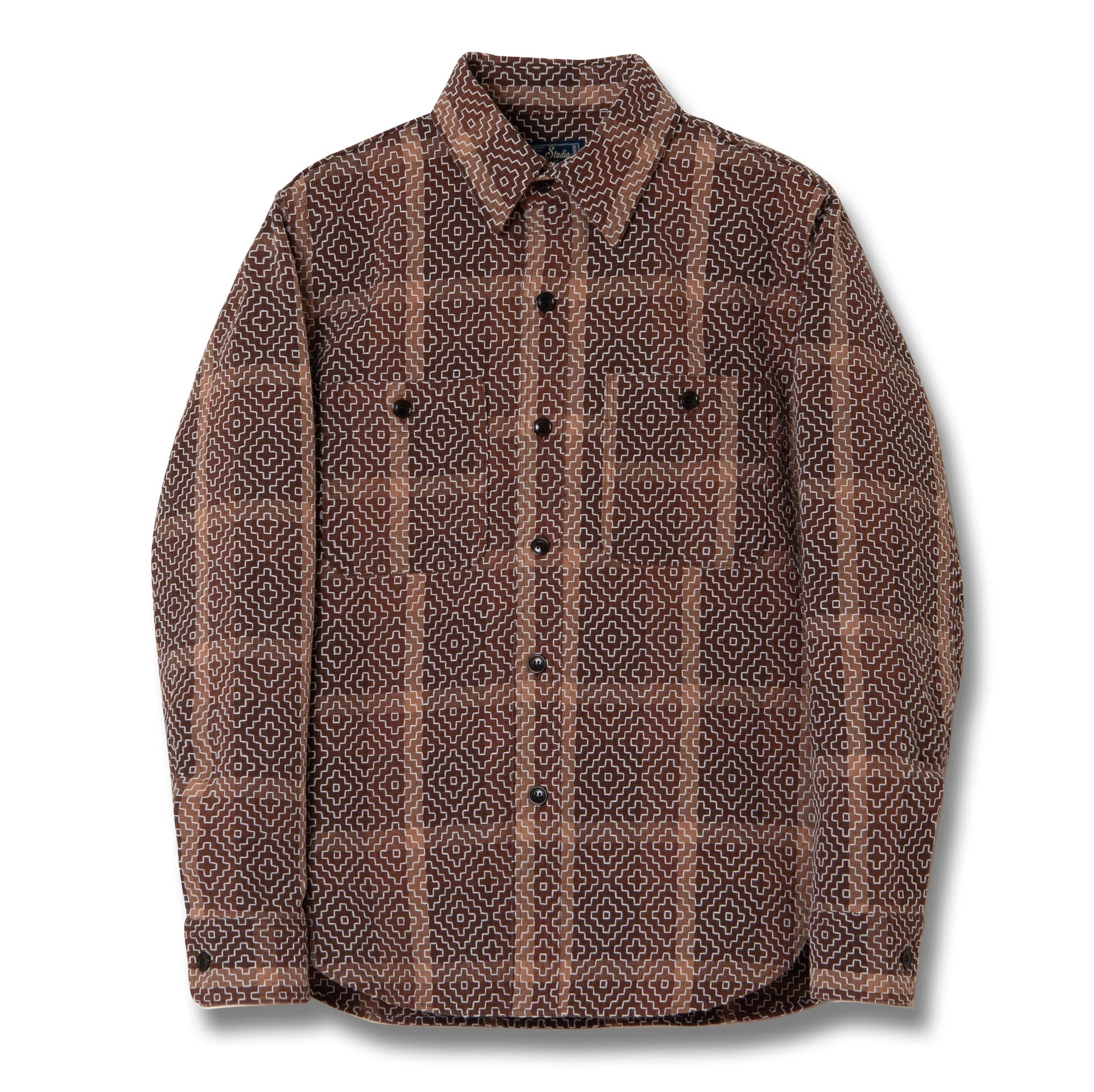 The kakishibu dye produces warm, earthy tones that deepen over time, while the sashiko reinforces key panels and gives the shirt distinctive visual dimension. Finished with classic work shirt styling (patch pockets, reinforced seams, and button closure), this piece balances heritage craftsmanship with everyday utility.