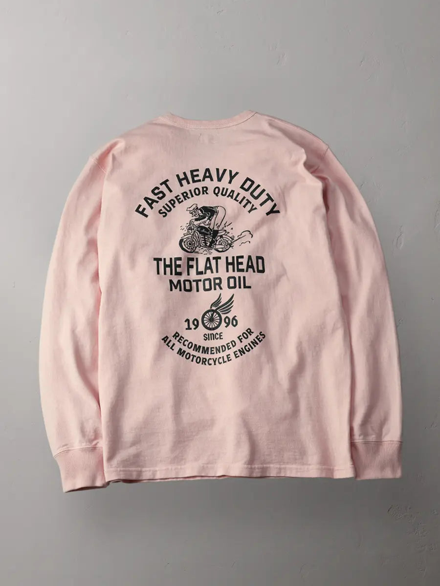 A long-sleeved T-shirt by The Flat Head, featuring a bold and playful design inspired by an advertisement for premium oil, prominently displayed on the back, and representing the fictional brand Flat Head Motor Oil.